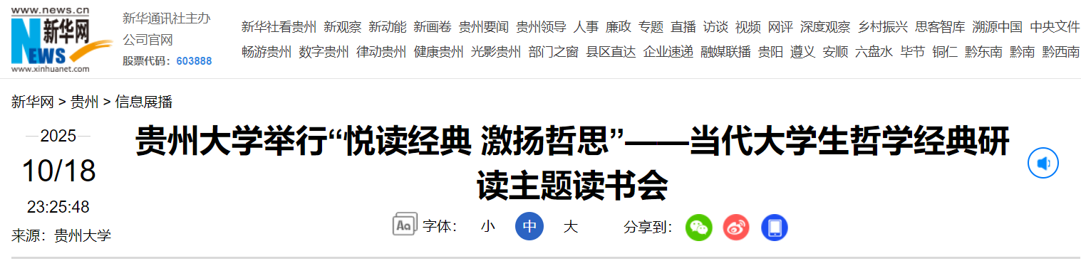 书香弥漫溪山校园,哲思启迪美好人生。10月17日,新时代立德树人工程之“书香浸润 典耀溪山”“悦读经典 激扬哲思”——当代大学生哲学经典研读主题读书会在中国文化书院举行。贵州大学党委书记杨未、副校长陈艳波出席,复旦大学特聘教授邓安庆、中山大学哲学学院教授陈乔见、南京大学哲学学院副教授韩玉胜、上海社会科学院哲学研究所研究员赵琦、贵州大学哲学学院教授张柯及部分师生代表参加读书会。